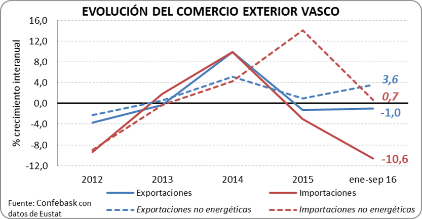 - En 2016, se mantiene el pulso exportador. Hasta septiembre bajan las exportaciones un 1%, pero las exportaciones no energéticas suben un 3,6%.