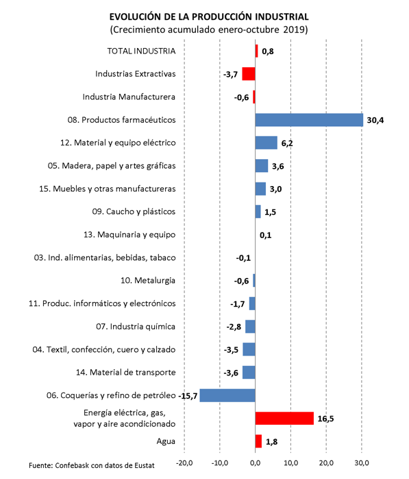 - Los mejores comportamientos se han dado en productos farmacéuticos; energía eléctrica, gas, vapor y aire acondicionado; material y equipo eléctrico; madera, papel y artes gráficas; muebles y otras manufactureras, y caucho y plásticos. Sectores relevantes como maquinaria y equipo o alimentarias mantienen la producción, mientras que destacan los descensos en refino de petróleo, material de transporte y química, con un leve descenso en metalurgia