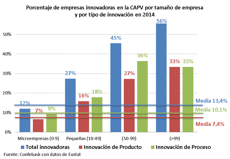 El 13,4% de las empresas vascas son innovadoras. Sin embargo, sólo el 12% de las microempresas los son, subiendo el porcentaje al 27% en el caso de las pequeñas empresas de 10 a 50 empleados, al 45% en las empresas de 50 a 100 empleados, y hasta el 56% en las empresas de 100 y más trabajadores.